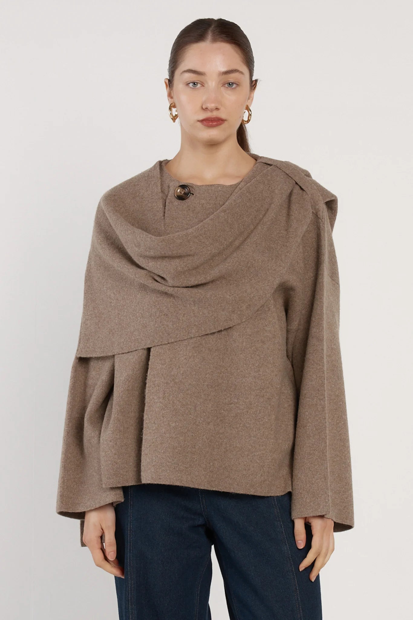 The Amaris Cape Coatigan redefines transeasonal layering with its draped wrap neckline and statement button detail. Cut in a relaxed, oversized silhouette, it falls effortlessly over the body for a soft yet polished finish. Wide, boxy sleeves enhance its modern proportions, allowing for easy layering. Crafted in a cosy knit, it’s an elevated essential for refined everyday dressing.