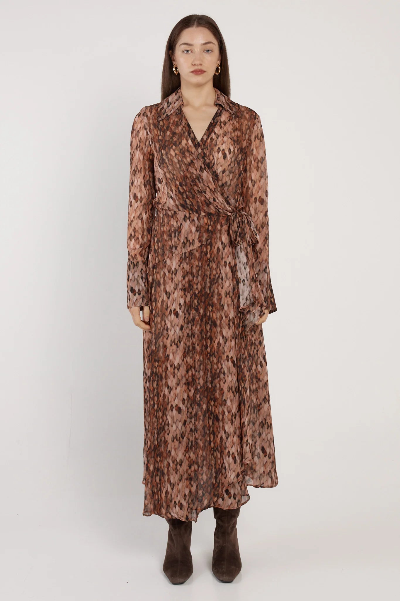 The Isla Wrap Dress embodies effortless sophistication. The wrap-front silhouette cinches softly at the waist with a self-tie detail, creating refined shape. A collared neckline adds polish, balancing its fluid movement. An elevated trans-seasonal piece in an exclusive print.