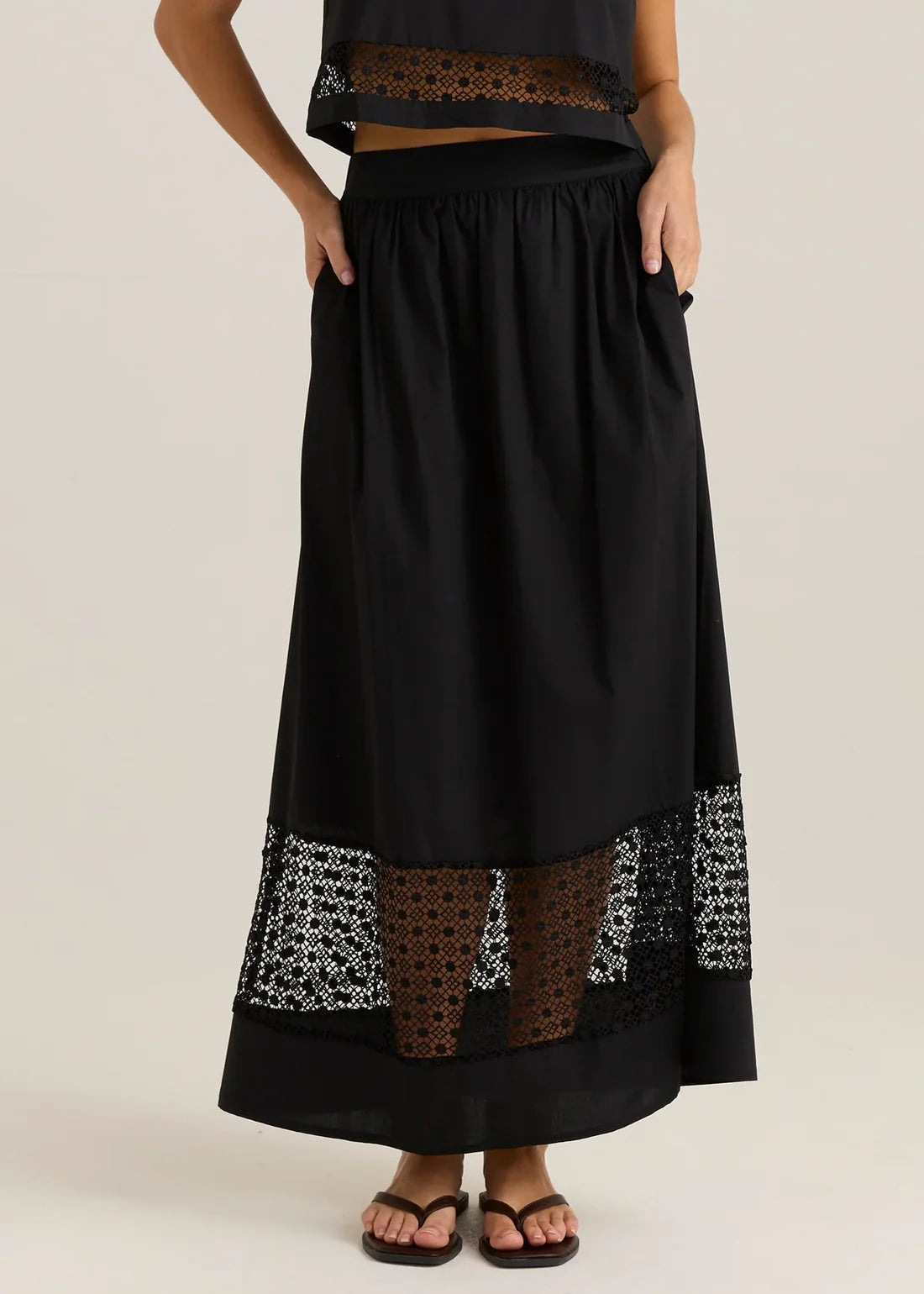This lace-detailed skirt offers a flattering shape with a smooth front finish and comfortable stretch waistband at the back. Side pockets add practicality without compromising style. Feminine and wearable — the best combination. Wear with the Sass Nixie Lace Crop Cami for a matching set.