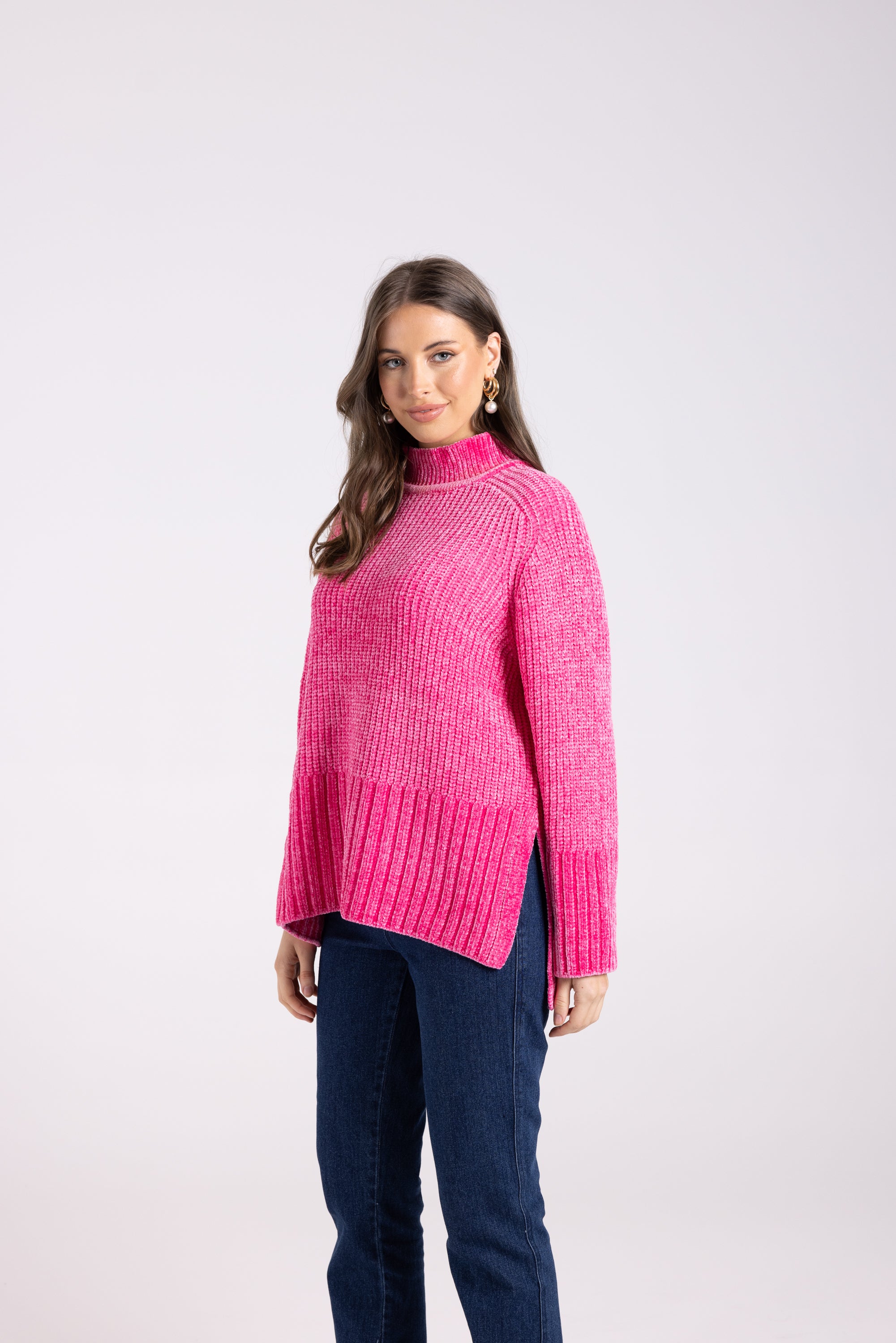 The Two-T's mock turtle neck knit is crafted from a luxurious 100% polyester chenille, which makes it super soft and warm, perfect for those cold winter days. The bright pink colour will make those dull winter days a bit brighter with the pop of colour. Wear back with jeans or leggings for a elevated casual look.