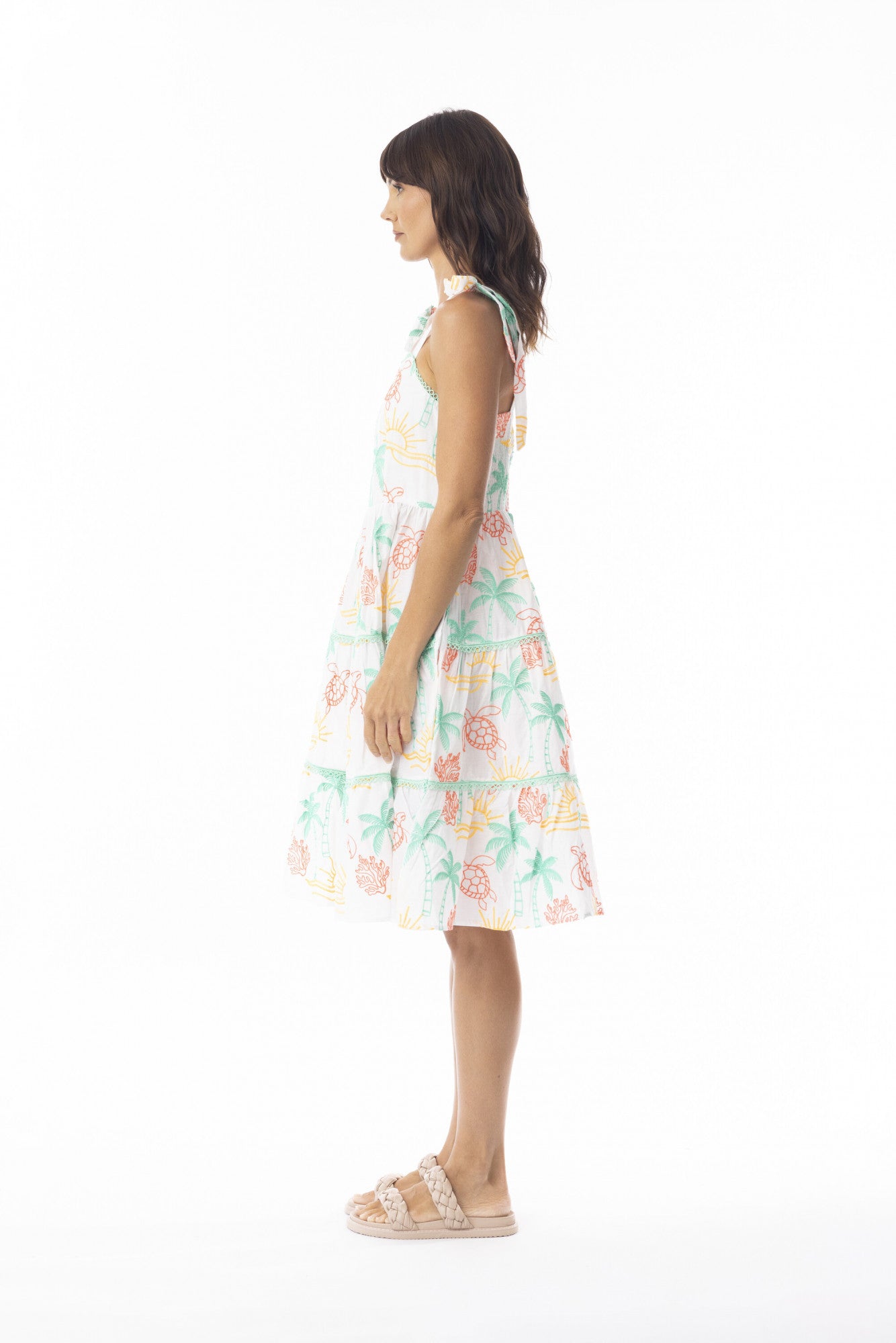 Write your escape story in the Escape By OQ Coral Tie Strap Dress. Its light, flowy tiered skirt, is made from a lightweight cotton voile, this dress ensures breathability and comfort. The vibrant bright tropical embroidered palm, turtle,, coral and sun will add a pop of colour to your summer wardrobe. With its fun strappy tie at the shoulders, this dress offers a carefree yet chic look that’s ideal for soaking up the sun in style.