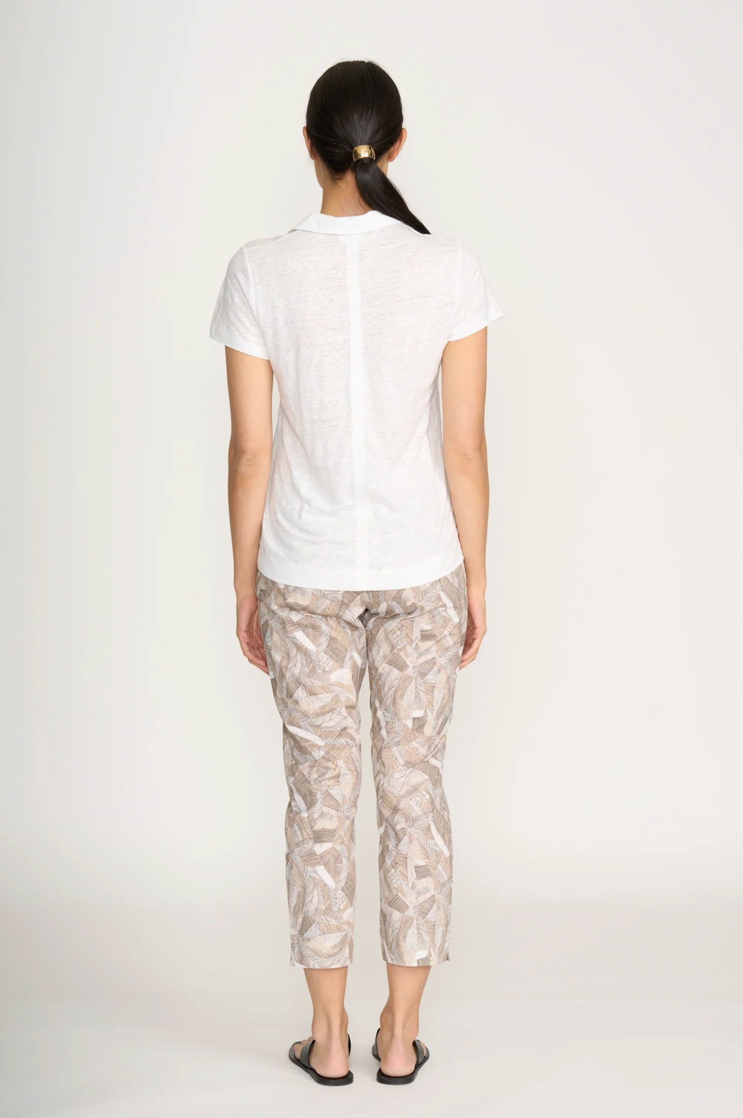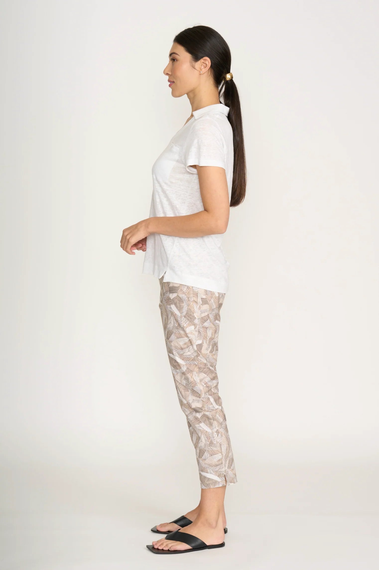 Fuss Free 7/8 Taper Capri with flat elastic for comfort waistband and slim clean leg line. Wonderful to wear all day and slim enough to wear your longer line shirts and tops .
