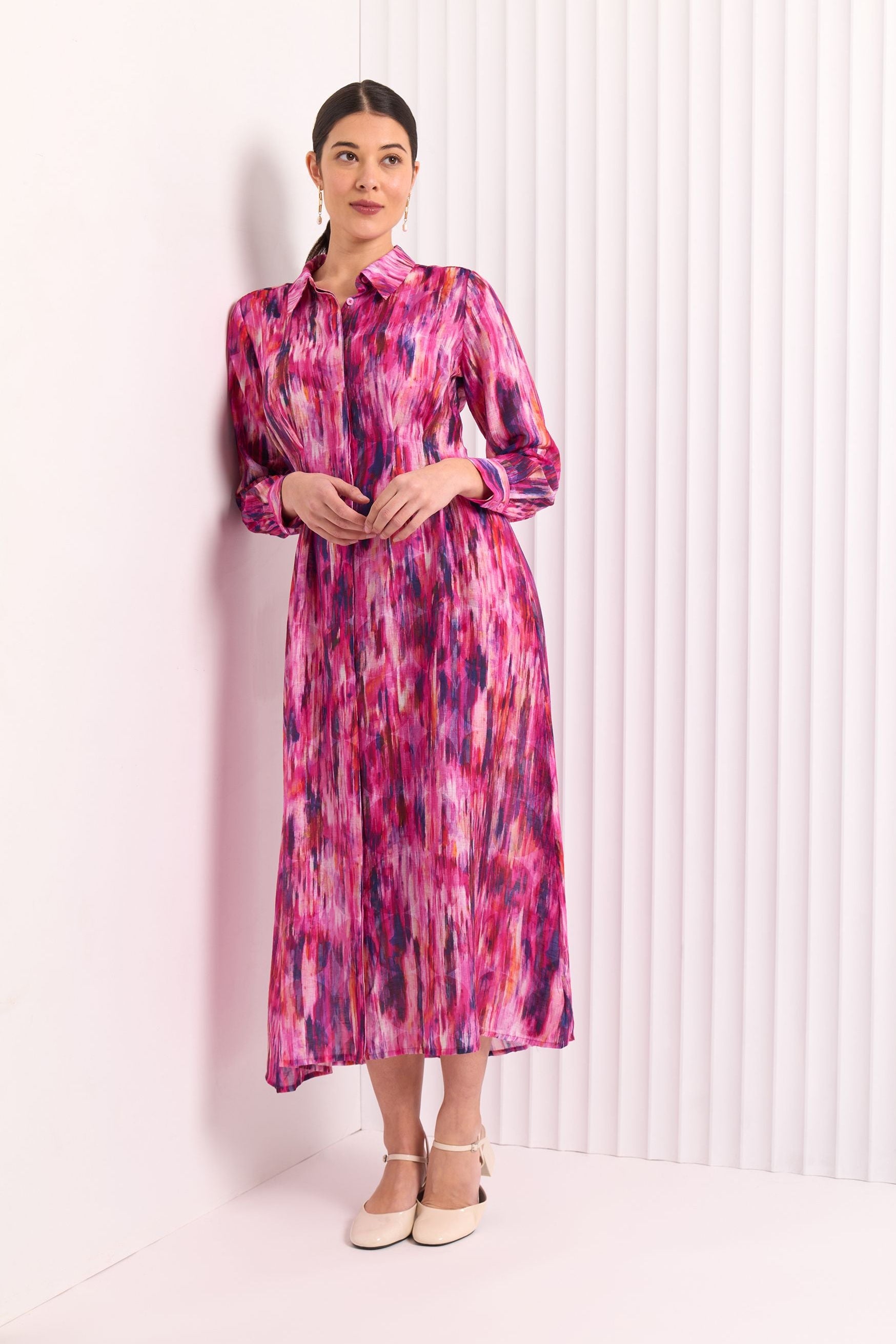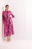The elegant Foil Master Plan midi shirt dress features a sleek collar detail that flows into a sleek button through enclosure on the relaxed fit through the body. The silhouette cinches in the waist with smalll back panel darts to give a sleek line. The relaxed full length sleeves are adorned with button up cuffs that dances at the wrists. Fabricated with the Foil Master Plan print in Illusions you are sure to make a entrance wearing this statement dress.